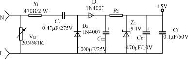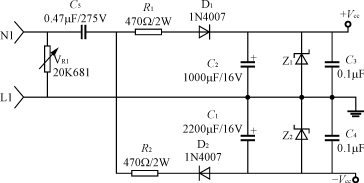 輸入電路的電阻R1(或R1、R2)要采用品質(zhì)較好的金屬膜電阻或水泥電阻,功率2~5W,阻值100~820Ω;降壓電容C2(或C5)采用高質(zhì)量的高壓金屬化聚丙烯電容,一般0.22~0.47μF,耐壓應≥AC250V,電容的容量過大會引起視在功率超標。