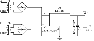 三相電度表有三相三線,三相四線,輸入電壓有3×(220~240)V/380~400V、3×57V/100V等。三相電度表供電電路可以參考單相電度表電源的設計方法,對于三相四線供電電路,可以在每一相線對零線之間接1只線性變壓器,共3只線性變壓器;對三相三線可以取一相如Β相作為公共地線,A、C相對Β相接2只線性變壓器。這些變壓的副邊單獨整流后再將輸出的正極接在一起、負極接在一起,經(jīng)電容濾波后,再通過DC/DC變換器輸出穩(wěn)定電壓,向電度表供電,如圖5所示。