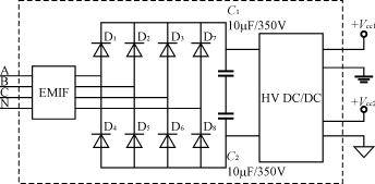這種供電方式體積和重量較大,成本也較高,顯然按以上電路連接時,對三相四線供電時不能缺零線,對三相三線供電時不能缺公共地線,如B相;另外,有的供電局用戶要求,三相電度表輸入端任意兩線有電壓輸入時都能工作,則圖5的設計便不能達到目的;當采用三相電度表專用開關電源模塊供電時,可解決以上問題,其內(nèi)部結構圖如圖6所示。