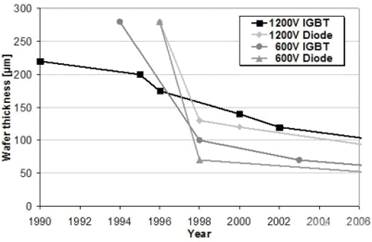 由于導通電壓和關斷損耗在很大程度上取決于晶圓的厚度,因此需要做更薄的IGBT。圖4顯示了英飛凌600/1,200VIGBT和EMCON二極管的晶圓厚度趨勢。對于新型1,200VRC-IGBT而言,120um厚度晶圓將是標準工藝。這需要進行復雜的晶圓處理,包括用于正面和背面的特殊處理設備。將晶圓變薄可通過晶圓打磨和濕式化學蝕刻工藝實現。
