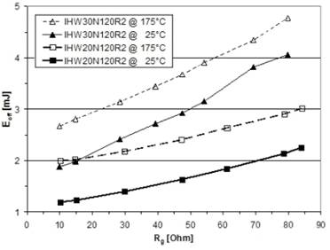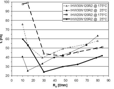 在典型飽和壓降Vce(sat)=1.6V@25℃/1.85V@175℃和典型正向電壓Vf=1.25V@175℃(額定電流)的條件下,功率損(特別是軟開關應用的導通損耗)可大幅度降低。由IHW20N120R2的下降時間的切線可看出高速度—tf=24ns@25℃和Rg=30Ω(44ns@175℃)。IHW30120R2在下降時間方面是最為出色的:tf=33ns@25℃,Rg=30Ω;tf=40ns@175℃。(在硬開關條件下測量,參見帶有Eoff曲線的圖6和圖7)。