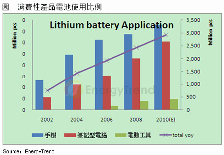 消費性產品的發展趨勢迅速牽動電池產業,根據集邦科技(TrendForce)旗下研究部門 EnergyTrend 表示,鋰電池隨著量產數量增加,價格與性能也逐漸為消費者所接受,包括手機電池與 NB 電池,也以鋰電池為使用主流,而伴隨著新材料的革新,動力鋰電池也成功在電動工具以及兩輪車輛上嶄露頭角,讓鋰電池突破僅有消費性產品的應用局限。