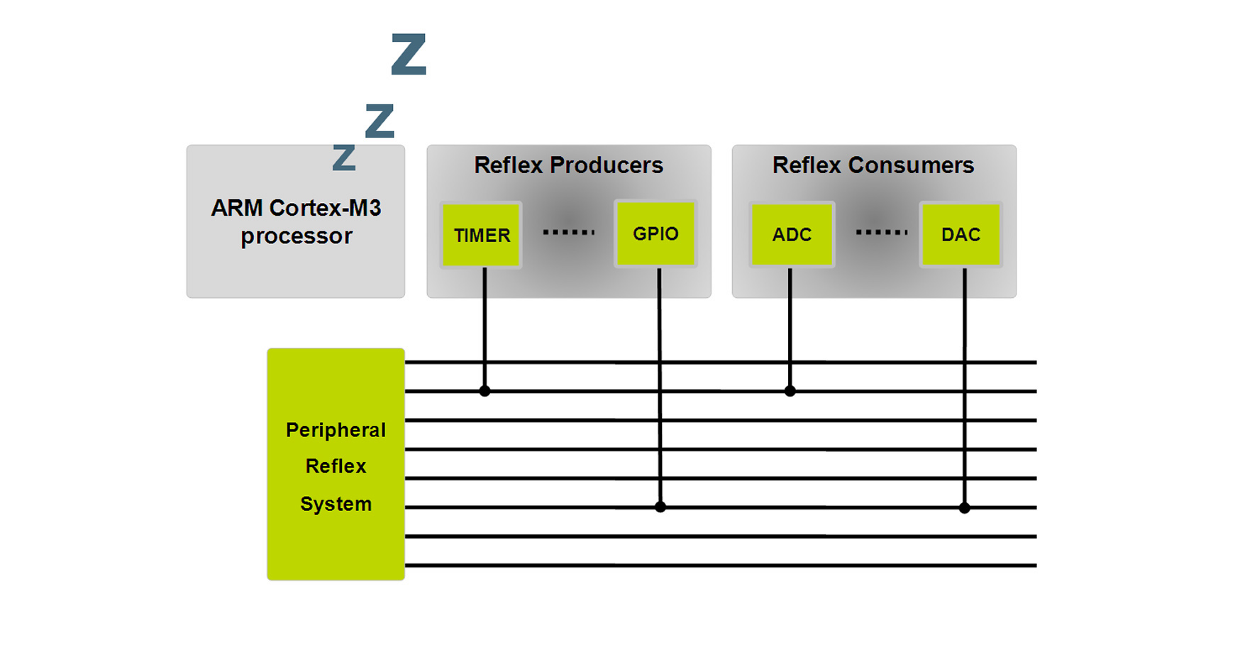 盡管有一個高效的32位處理器內核資源,Energy Micro公司的設計人員認識到在典型應用中還有很多功能沒有達到全面的處理能力,如果在待機狀態下,即使是最節能的內核也會使用較少的電源。和標準的32位一樣,ARM架構總線與芯片上所有的功能性模塊互聯,一個輔助總線或互連矩陣被稱為外圍設備反射系統。如圖4所示,使用該互連,外圍設備就能從ARM內核中與外圍設備溝通,無任何干擾。
