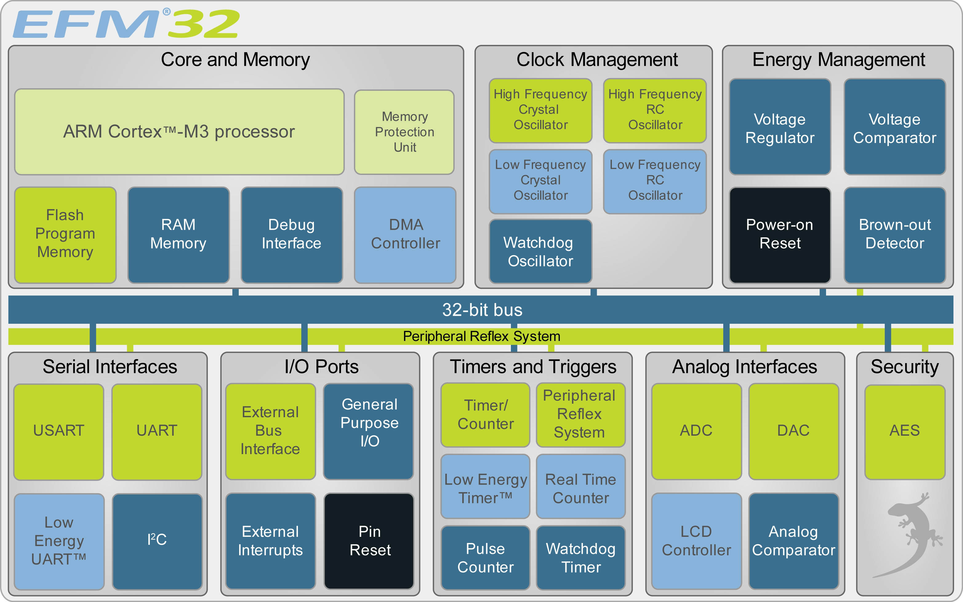 盡管有高效的32位處理器內核的存在,有許多應用功能并不要求它具有全套處理能力,如果在待機時,即使是最節(jié)能的內核也會使用較少的電源!因此EFM32有一個互連結構稱為外圍設備反射系統(tǒng),它使外圍設備與外圍設備之間對話而沒有來自ARM內核的任何干擾。節(jié)能的微控制器能將功率需求減少到盡可能少,能源敏感的應用會尊重他們的冠名權。