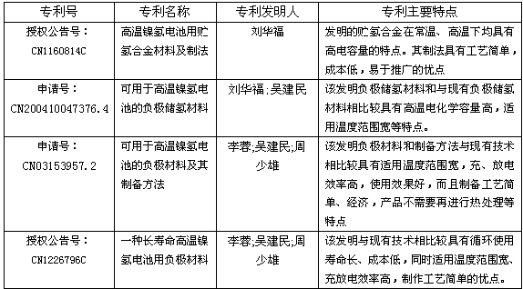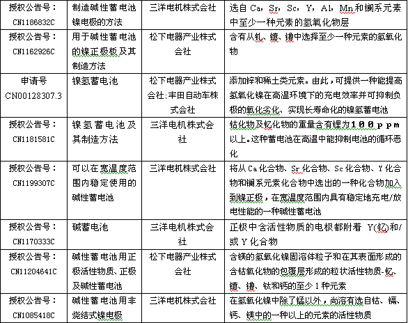 在電池配料時,通過機械混合法添加周期表中ⅡA、ⅢB、ⅣB、ⅦB、ⅧB、ⅡB主族元素和3、4、5周期的元素、氧化物或氫氧化物,能較好地提高或改善鎳氫高溫性能。世界著名電池制造公司在華申請授權的專利中多有介紹,如日本松下、三洋;中國比亞迪;德國H.C.施塔克等公司。詳細見下表: