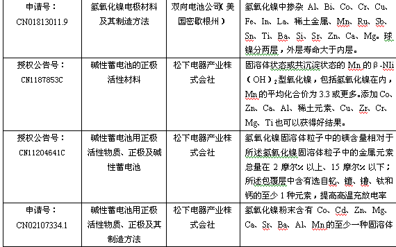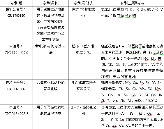 將上述元素在正極材料球形氫氧化鎳生產過程,采用摻雜到層狀結構氫氧化化鎳中,取代部分鎳離子,形成固溶體,使元素之間均勻性更好;在球形氫氧化鎳外面包覆一層鈷的氫氧化物等,對于提高電池整體性能,均有改善功能。具有代表性的專利見下表:
