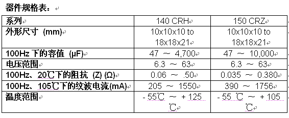 新電容器提供最嚴格的回流焊曲線,具有從10mmx10mm到更大的18mmx18mm的7種外形尺寸。近日發布的140 CRH器件的高溫性能達+125℃,150 CRZ電容器具有超低的“Z”阻抗,或是在100kHz下提供0.035Ω的最大阻抗額1756mA的紋波電流。