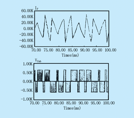 帶自控直流母線的并聯(lián)APF,有一類似于靜態(tài)補(bǔ)償器(STATCOM)的拓?fù)洌琒TATCOM是用于電力系統(tǒng)中補(bǔ)償無功功率的。并聯(lián)的APF,以注入相等而反向的諧波電流對負(fù)荷電流的諧波進(jìn)行補(bǔ)償。此時,并聯(lián)APF是作為注入諧波分量的電流源而工作的,諧波分量由負(fù)荷產(chǎn)生,但已移相180o。圖4為并聯(lián)APF的接線圖,圖5表示APF補(bǔ)償?shù)墓ぷ髟怼槟茌敵鰣D5所示濾波器電流波形的IF,需要設(shè)置圖4中的控制電路,以便產(chǎn)生圖6所示的Vfab脈寬調(diào)制電壓圖。