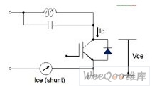 為了測量IGBT的集電極電流Ice,應在發射極和地之間使用超低阻值的取樣電阻器。圖11為Vce和Ic的波形(搪瓷燒鍋負載)。工作頻率為29.1kHz,LC電路在諧振范圍之外(電磁爐的溫度模式為50℃)。