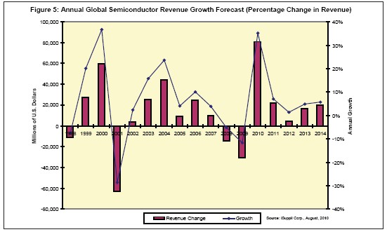 iSuppli公司預測,半導體產業將連續增長七個季度,然后在2011年第一季度出現季節性下降。 這將是該產業在1991至1995年期間連續增長19個季度之后,連續增長時間最長的一次。
