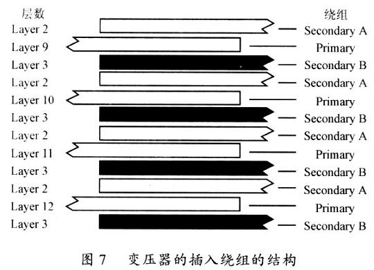 插入技術(shù)是指在布置變壓器原、副邊繞組時(shí),使原邊繞組與副邊繞組交替放置,增加原、副邊繞組的耦合以減小漏感,同時(shí)使得電流平均分布,減小變壓器損耗。
