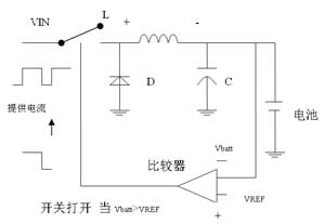 快速調節器的操作是通過控制一個晶體管開關的占空比來實現的。占空比會自動增加以使電池流入更多的電流。當VBATT<VREF時,一個比較器會將開關閉合(參見圖5a),電流流入電池和電容C,這個電流同時也存儲在電感L中。VBATT持續升高,直到超過VREF,調節此時比較器將開關斷開(參見圖5b),存儲在電感中的電流迅速下降直到二極管偏置,使得電感電流以減速度流入電池,電容C在電感電流衰減后開始放電。并且最后VBATT開始下降,當VBATT低于VREF時,比較器再次將開關閉合并開始另一次循環。在較大的范圍內如果減小占空縮短閉合的時間,平均電壓就會下降,反之亦然。因此可以通過控制占空比的方法調節電壓或電流至所需要的值。