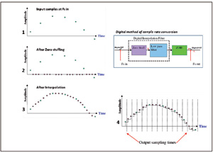SRC利用輸出采樣速率極高的插值濾波器和零階保持器(ZOH)將離散時間信號轉換為連續時間信號。插值值被饋送至ZOH,并以Fsout的輸出采樣頻率進行異步采樣。