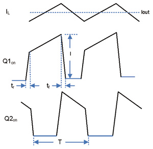 在頻域內測量輻射和傳導電磁干擾,這就是對已知波形做傅里葉級數展開,本文中我們著重考慮輻射電磁干擾性能。在同步降壓轉換器中,引起電磁干擾的主要開關波形是由Q1和Q2產生的,也就是每個場效應管在其各自導通周期內從漏極到源極的電流di/dt。圖2所示的電流波形(Q1on和Q2on)不是很規則的梯形,但是我們的操作自由度也就更大,因為導體電流的過渡相對較慢,所以可以應用HenryOtt經典著作《電子系統中的噪聲降低技術》中的公式1。我們發現,對于一個類似的波形,其上升和下降時間會直接影響諧波振幅或傅里葉系數(In)。