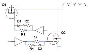 諧波系列的電磁干擾幅度受Q1和Q2的通斷影響。在測量漏源電壓VDS的上升時間tr和下降時間tf,或流經Q1和Q2的電流上升率di/dt時,可以很明顯看到這一點。這也表示,我們可以很簡單地通過減緩Q1或Q2的通斷速度來降低電磁干擾水平。事實正是如此,延長開關時間的確對頻率高于f=1/πtr的諧波有很大影響。不過,此時必須在增加散熱和降低損耗間進行折中。盡管如此,對這些參數加以控制仍是一個好方法,它有助于在電磁干擾和熱性能間取得平衡。具體可以通過增加一個小阻值電阻(通常小于5Ω)實現,該電阻與Q1和Q2的柵極串聯即可控制tr和tf,你也可以給柵極電阻串聯一個"關斷二極管"來獨立控制過渡時間tr或tf(見圖3)。這其實是一個迭代過程,甚至連經驗最豐富的電源設計人員都使用這種方法。我們的最終目標是通過放慢晶體管的通斷速度,使電磁干擾降低至可接受的水平,同時保證其溫度足夠低以確保穩定性。
