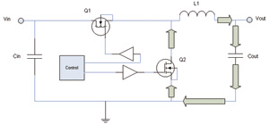 當Q1關斷、Q2導通時,就形成了第二個回路。之后存儲在L1內的能量流經輸出電容器和Q2,如圖5所示。這些回路面積控制對于降低電磁干擾是很重要的,在PCB走線布線時就要預先考慮清器件的布局問題。當然,回路面積能做到多小也是有實際限制的。