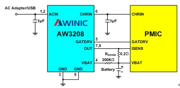 AW3206和AW3208的輸入引腳ACIN到地需要一個不小于1uF的輸入電容。這個輸入電容除了去耦外,還可以有效減小適配器在熱插拔時由于連接線的寄生電感效應產生的瞬態過沖電壓。另外這個電容建議選取耐壓不低于15V的X7R或X5R陶瓷電容。