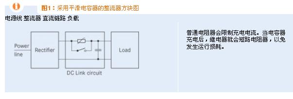 當電容器充電時,通常需要串聯一個電阻器來限制充電電流,以免產生超過允許范圍的強電流峰值。一般是采用固定式普通電阻或負溫度系數(NTC)電阻實現這一功能。在大多數情況下,會在充電之后使用一個由時間或電壓控制的繼電器來短接限流元件。充電電流的制約對整流器和轉換器系統來說非常重要,因為產生的沖擊電流峰值如果未得到限制,可能會觸發熔絲或使整流器遭受超過允許范圍的強電流。圖1所示為傳統整流器或轉換器系統的方塊圖。