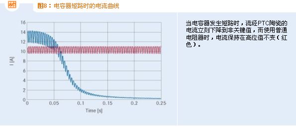 在這兩種情況下,充電電流的時間曲線幾乎相同。PTC陶瓷與固定電阻在電流特性方面的細微差別的產生原因是: