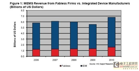圖所示為2006-2010年IDM與無(wú)晶圓制造半導(dǎo)體公司的MEMS營(yíng)業(yè)收入。