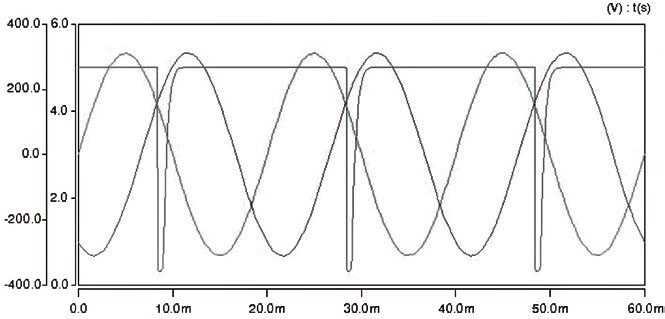 以上設(shè)計(jì)方案在Sabe r環(huán)境下進(jìn)行了仿真驗(yàn)證,仿真結(jié)果如圖5所示,其中兩正弦波為三相電源的其中兩相電壓,脈沖電壓為送至單片機(jī)外部中斷INT0的信號。從圖5可以清晰的看到,在自然換相點(diǎn)附近,產(chǎn)生了一組幅值為5V,脈寬約為2ms,頻率為50Hz的脈沖信號,而在自然換相點(diǎn)處,產(chǎn)生了一個(gè)近乎90度的下降沿,有利于單片機(jī)進(jìn)行捕捉。改變時(shí)間常數(shù)τ可以改變脈沖電壓的脈寬,如圖5所示,在自然換相點(diǎn)處產(chǎn)生了一組幅值為5V,脈寬約為10mS,頻率為50Hz的脈沖信號。 圖5 為經(jīng)檢測電路得到的脈沖電壓,圖6為不同τ值檢測電路得到的脈沖電壓。