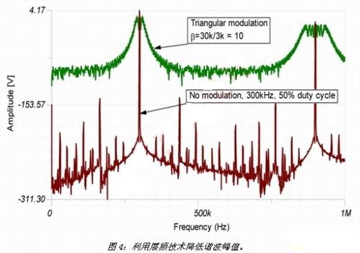 最后,本文將探討另一項越來越受到廣泛使用的技術,能夠將峰值諧波能量散布于較大的頻帶,以有效降低該能量。該技術被稱為展頻頻率抖動(SSFD),能夠通過諧波峰值的降低將噪聲信號從窄頻變成寬頻,以改變噪聲頻譜。其中必須了解能量頻譜的變化,而整個能量則維持不變。最終的結果是噪聲水平一般會增加,從而損害高保真系統。圖4顯示發生的諧波擴散及峰值降低。一般降低的幅度為5至10dB,后續的諧波會增加峰值降低的幅度。