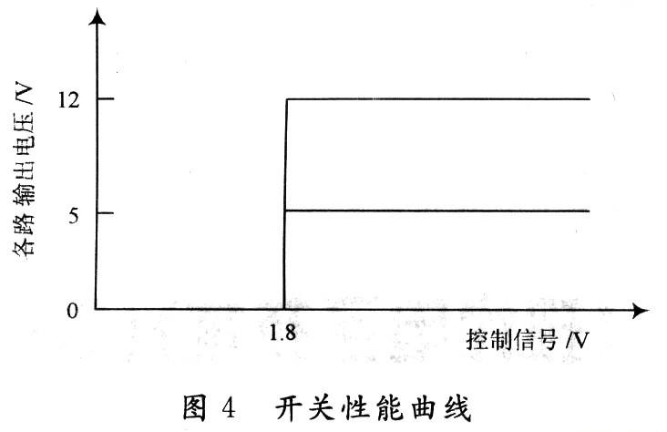 場(chǎng)效應(yīng)管選擇了增強(qiáng)型P溝道場(chǎng)效應(yīng)管IRF9640和增強(qiáng)型N溝道場(chǎng)效應(yīng)管VN2222L。以場(chǎng)效應(yīng)管IRF9640作為開關(guān)管來控制電路的通和斷,以場(chǎng)效應(yīng)管VN2222L作為開關(guān)控制管來控制場(chǎng)效應(yīng)管IRF9640的開和關(guān)。當(dāng)控制信號(hào)輸入端輸入高電平時(shí),開關(guān)電路導(dǎo)通;當(dāng)控制信號(hào)輸入端輸入低電平時(shí),開關(guān)電路斷開。經(jīng)過試驗(yàn)測(cè)得:當(dāng)控制信號(hào)電壓從0 V逐漸上升到1.8 V時(shí)開關(guān)導(dǎo)通;當(dāng)電壓從高電平(如3.3 V)逐漸下降到1.8 V時(shí)開關(guān)斷開。此開關(guān)電路的性能如圖4所示。
