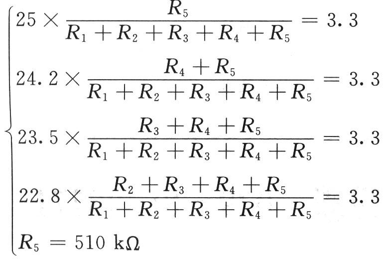 電池電壓取樣電阻網(wǎng)絡(luò)是通過取樣電阻的組合對(duì)電池的輸出電壓進(jìn)行分壓取樣,各電阻端點(diǎn)對(duì)應(yīng)的電池電壓狀態(tài)值分別為:R2對(duì)應(yīng)22.8 V,R3對(duì)應(yīng)23.5 V,R4對(duì)應(yīng)24.2 V,R5對(duì)應(yīng)25 V。當(dāng)電池輸出的電壓值等于各個(gè)電阻設(shè)定的狀態(tài)值時(shí),則該電阻端取樣電壓為3.3 V;當(dāng)電池輸出的電壓值大于各個(gè)電阻設(shè)定的狀態(tài)值時(shí),則該電阻端取樣電壓大于3.3 V;當(dāng)電池輸出的電壓值小于各個(gè)電阻設(shè)定的狀態(tài)值時(shí),則該電阻端取樣電壓小于3.3 V。取樣電阻R1,R2,R3,R4,R5的取值可由下面的方程組求得: