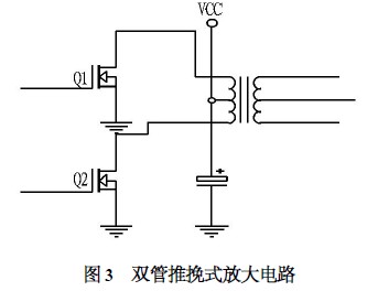 ( 3) 雙管推挽放大電路。圖3所示為雙管推挽放大電路。該方案采用了2 個MOS 管輪流導通,比采用4 個MOS管損耗低,而且輸出電壓比單端方式的要穩,為達到設計所需要的效率,本文選用了該方案。