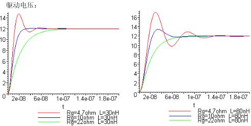 可以看到當(dāng)Rg比較小時(shí)驅(qū)動(dòng)電壓上沖會(huì)比較高,震蕩比較多,L越大越明顯,此時(shí)會(huì)對(duì)MOSFET及其他器件性能產(chǎn)生影響。但是阻值過大時(shí)驅(qū)動(dòng)波形上升比較慢,當(dāng)MOSFET有較大電流通過時(shí)會(huì)有不利影響。