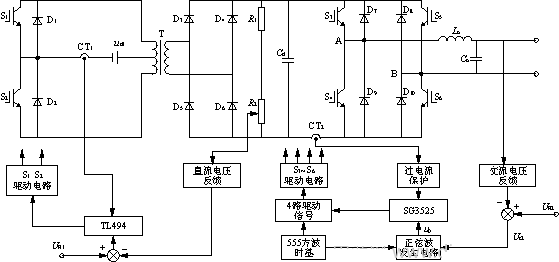 再經過全橋DC/AC逆變電路,得到220V/50Hz交流電壓輸出。為保證系統可靠運行,防止主電路對控制電路的干擾,采用主、控電路完全隔離的方法,即驅動信號用光耦隔離,反饋信號用變壓器隔離,輔助電源用變壓器隔離等。