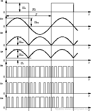 振蕩器腳5須外接電容CT,腳6須外接電阻RT。振蕩器頻率f由外接電阻RT和電容CT決定,f=1.18/RTCT。逆變橋開關頻率定為10kHz,取CT=0.22μF,RT=5kΩ。振蕩器的輸出分為兩路,一路以時鐘脈沖形式送至雙穩態觸發器及兩個或非門;另一路以鋸齒波形式送至比較器的同相輸入端,比較器的反向輸入端接誤差放大器的輸出。誤差放大器的輸出與鋸齒波電壓在比較器中進行比較,輸出一個隨誤差放大器輸出電壓高低而改變寬度的方波脈沖,再將此方波脈沖送到或非門的一個輸入端?;蚍情T的另兩個輸入端分別為雙穩態觸發器和振蕩器鋸齒波。雙穩態觸發器的兩個輸出互補,交替輸出高低電平,將PWM脈沖送至三極管V1及V2的基極,鋸齒波的作用是加入死區時間,保證V1及V2不同時導通。最后,V1及V2分別輸出相位相差180°的PWM波。