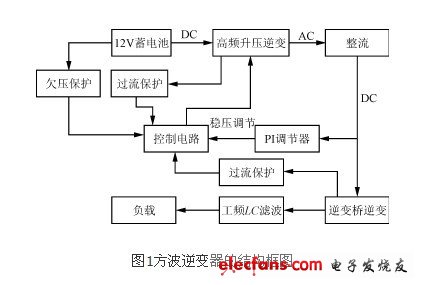 目前,構成DC/AC逆變的新技術很多,但是考慮到具體的使用條件和成本以及可靠性,本電源仍然采用典型的二級變換,即DC/DC變換和DC/AC逆變。首先由DC/DC變換將DC 12V電壓逆變為高頻方波,經高頻升壓變壓器升壓,再整流濾波得到一個穩定的約320V直流電壓;然后再由DC/AC變換以方波逆變的方式,將穩定的直流電壓逆變成有效值稍大于220V的方波電壓;再經LC工頻濾波得到有效值為220V的50Hz交流電壓,以驅動負載。