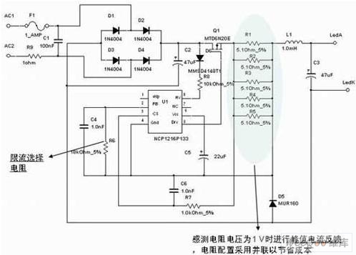 另一方面,如上所述,在不需要隔離的應用中,可以采用較為簡單的降壓拓撲結構,這種結構所使用的電感比變壓器小得多,而且只需要很少的元件來實現(xiàn)這種解決方案。這種架構采用的是峰值電流控制(PCC)模式,工作在深度連續(xù)導電模式(CCM)。這種架構具有多種優(yōu)勢,如可以消除使用大電解輸出電容、具有“良好”穩(wěn)流的簡單控制原理,以及能夠充分利用安森美半導體的動態(tài)自供電(DSS)技術能力來直接從交流線路為驅動器供電。圖3顯示的是安森美半導體NCP1216 PWM電流模式控制器的應用設計示意圖。