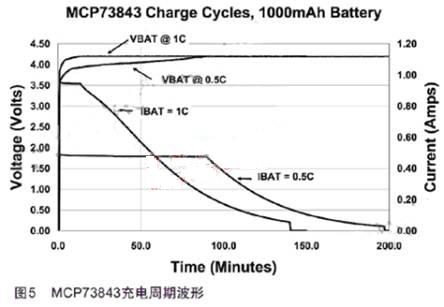 利用MCP73843在1C和0.5C恒流充電速率下的整個充電周期如圖5.以0.5C而不是1C速率充電時,充電結(jié)束的時間大約晚了一個小時。充電終止電流從0.07C降到0.035C,使得最終電池容量從~98%增長到~100%.系統(tǒng)設(shè)計師必須在充電時間、功率損耗和可用電池容量之間進行權(quán)衡。