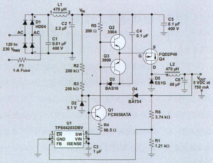 圖 1 顯示了完整的轉換器。整流器電路使用一個標準、快速開關整流器二極管橋接 (D1) 和一個LC濾波器(L1和C2),我們將對其余組件進行更加詳細的介紹。