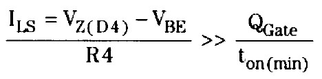 電容C4和二極管D3對驅動電路的功能至關重要。通過選擇電阻R5來將12V柵極驅動電平設置在整流器輸出電壓以下。二極管D3將電容C4限定在這一電平。特別是,當U1的開關引腳輸出一個低信號來開啟功率FET時,信號被電平位移到Q3的基極。晶體管Q3開啟,并快速地將Q4的柵—源電容CGS充電至 12V。如果沒有C4和D3的話,關閉Q4會讓Q3成為一種漏極接地的昂貴的高壓雙極型晶體管。當U1的開關引腳輸出一個高信號來關閉功率FET時,該信號被電平位移至Q2的基極。Q2開啟,有效地將Q4的柵極與輸入電壓連接。在沒有起到本地電源作用的電容C4的情況下,晶體管Q2和Q3無法提供快速(且因此而高效地)上拉或下拉Q4柵極電容所必需的快速電流峰值,注意到這一點很重要。另外,由R4設定的電平位移器電流ILS必須足夠高,以在ton(min) 期間移動Q4的柵極電荷QGate。也就是說: