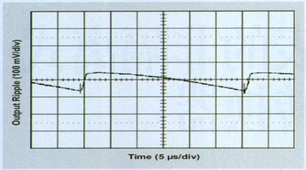 相對較高的K值最小化了電感值,并且經證明是可以接受的,因為這種特殊應用的穩態輸出紋波要求小于0.02 × VOUT,即高負載時的100mVPP。磁滯后,TPS6420x控制器一般在輸出電壓有一些紋波時工作效果最佳,建議使用至少 50mΩ ESR的輸出電容可產生ΔVPP(ESR) = ΔIL × RESR的紋波電壓,其一般遠超出電壓紋波的電容分量。圖2顯示了該應用測得紋波。