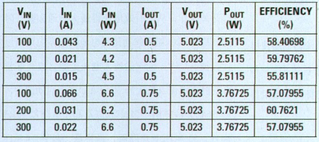 電容C4值設定大于Q4的柵極電容,但其必須足夠小,以便在更短控制器最小導通與斷開時間期間能夠得到再充電。圖3顯示了300V和500mA負載輸入電壓下,一個開關周期的柵極和漏極導通/斷開時間。表1顯示了測得的轉換效率。