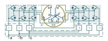 為了消除pwm電機(jī)驅(qū)動(dòng)系統(tǒng)共模電流,a.consoli等學(xué)者基于共模電壓補(bǔ)償技術(shù),提出了一種應(yīng)用于由兩個(gè)或多個(gè)功率變換器組成的多驅(qū)動(dòng)系統(tǒng)公共直流母線共模電流消除技術(shù),拓?fù)浣Y(jié)構(gòu)見圖6所示。該方法是在兩個(gè)功率變換器做適當(dāng)連接的基礎(chǔ)上,通過控制兩個(gè)變換器狀態(tài)序列而使共模電壓同步變化的新pwm調(diào)制策略。