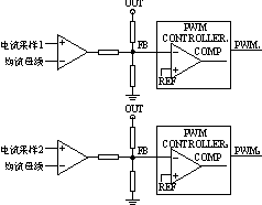 通過檢測RC網(wǎng)絡(luò)中C兩端的電壓,作為電流信號(hào),幾路電流信號(hào)(本例只有兩路)通過一個(gè)相同的電阻就得到了平均值均流母線,平均值均流母線電壓值與負(fù)載有關(guān),表征負(fù)載電流的大小。然后將每路采樣來的電流信號(hào)與母線電壓比較,得到誤差信號(hào),去修正輸出電壓參考信號(hào),從而對(duì)PWM控制器的占空比輸出進(jìn)行微調(diào),達(dá)到均流和穩(wěn)壓的目的。