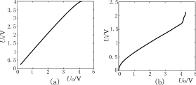 根據(jù)所設計的檢測電路進行實驗,實驗時,調(diào)節(jié)輸入電壓Ui的大小,并檢測與之對應的輸出電壓UO的大小,實驗結果如表1(a)所示。為了進行對比,同時測出沒有反饋的光耦的輸入與輸出電壓關系,并列在表1(b)。根據(jù)表1中(a)、(b)的數(shù)據(jù)分別繪出檢測電路與單個光耦的傳輸特性,分別如圖3(a)、(b)所示。