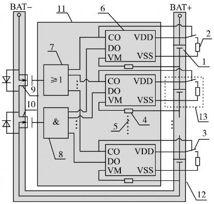 采用單節(jié)鋰電池保護芯片設(shè)計的具備均衡充電能力的鋰電池組保護板示意圖如圖1所示。其中:1為單節(jié)鋰離子電池;2為充電過電壓分流放電支路電阻;3為分流放電支路控制用開關(guān)器件;4為過流檢測保護電阻;5為省略的鋰電池保護芯片及電路連接部分;6為單節(jié)鋰電池保護芯片(一般包括充電控制引腳CO,放電控制引腳DO,放電過電流及短路檢測引腳VM,電池正端VDD,電池負端VSS等);7為充電過電壓保護信號經(jīng)光耦隔離后形成并聯(lián)關(guān)系驅(qū)動主電路中充電控制用MOS管柵極;8為放電欠電壓、過流、短路保護信號經(jīng)光耦隔離后形成串聯(lián)關(guān)系驅(qū)動主電路中放電控制用MOS管柵極;9為充電控制開關(guān)器件;10為放電控制開關(guān)器件;11為控制電路;12為主電路;13為分流放電支路。單節(jié)鋰電池保護芯片數(shù)目依據(jù)鋰電池組電池數(shù)目確定,串聯(lián)使用,分別對所對應(yīng)單節(jié)鋰電池的充放電、過流、短路狀態(tài)進行保護。該系統(tǒng)在充電保護的同時,通過保護芯片控制分流放電支路開關(guān)器件的通斷實現(xiàn)均衡充電,該方案有別于傳統(tǒng)的在充電器端實現(xiàn)均衡充電的做法,降低了鋰電池組充電器設(shè)計應(yīng)用的成本。