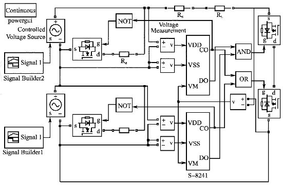 根據(jù)上述均衡充電保護板電路工作的基本原理,在Matlab/Simulink環(huán)境下搭建了系統(tǒng)仿真模型,模擬鋰電池組充放電過程中保護板工作的情況,驗證該設(shè)計方案的可行性。為簡單起見,給出了鋰電池組僅由2節(jié)鋰電池串聯(lián)的仿真模型,如圖5所示。