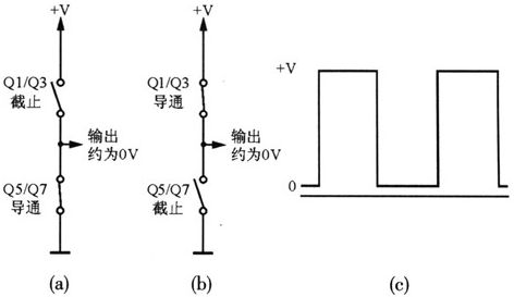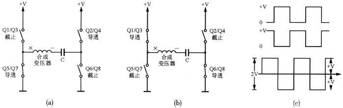在射頻激勵信號的負(fù)半周,MOS管QI/Q3截止,QS/Q7導(dǎo)通,如圖5(a)所示。而在射頻激勵輸入信號的正半周,MOS管Q1/Q3導(dǎo)通,QS/Q7截止,如圖5(b)所示。Q2/Q4和Q6/Q8的開關(guān)情況與此正好相反。跨在功率合成變壓器初級兩端的輸出信號就在半個(gè)周期里,在地(約為0V)和正電源間進(jìn)行一次切換,如圖5(c)所示。