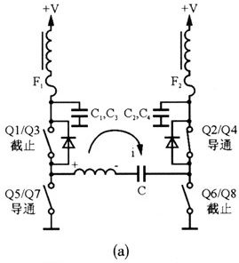 因?yàn)樵谟玫墓Ψ拍K產(chǎn)生的射頻電流必須流過合成變壓器的次級,并在已關(guān)斷的射頻功放模塊的初級繞組上感應(yīng)出射頻電壓。根據(jù)楞次定律,變壓器次級電流所產(chǎn)生的磁通總是試圖抵消初級電流所產(chǎn)生的磁通,所以,流過關(guān)斷功放輸出變壓器次級的電流感應(yīng)到初級的電壓后,一定和原來的輸出電壓極性相反。在如圖6(a)所示,由次級電流感應(yīng)到初級的電壓為左正右負(fù),說明關(guān)斷的射頻功放在導(dǎo)通狀態(tài)下的變壓器初級電壓極性是左負(fù)右正,與此相對應(yīng)的導(dǎo)通管為Q2/Q4,截止管為01/Q3,從而形成的低阻抗通路為:與Ql/Q3相并聯(lián)的反向二極管→旁路電容C1、C3→旁路電容C2、C4→Q2/Q4→隔直電容C。同理,圖6(b)所形成的低阻抗通路為:與Q2/Q4相并聯(lián)的反向二極管→旁路電容C2、C4→旁路電容C1、C3→Q1/Q3。