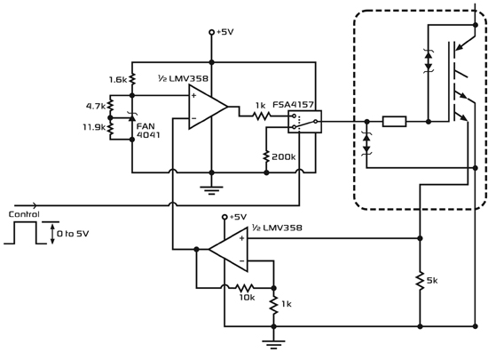 控制裸片和IGBT結合在多引腳的TO-220或TO-263封裝中。IGBT焊接在封裝件的管座(header)上,以最大限度降低IGBT與封裝件間的電阻和熱阻。控制裸片用絕緣的聚酰亞胺材料粘貼在同一管座上,使其與IGBT的高壓集電極隔離。