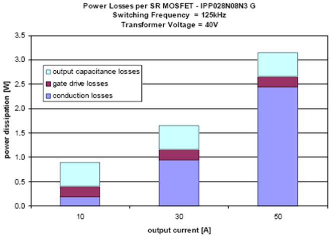 要優化SR MOSFET的效率,必須找到開關損耗與導通損耗之間的最佳平衡點。在輕負載條件下,RDS(on)導通損耗占總功耗的比例極低。在這種情況下,在整個負載范圍內基本保持不變的開關損耗是主要損耗。但是,當輸出電流較高時,導通損耗則成為最主要的損耗,其占總功耗的比例也最高,請參見圖2。