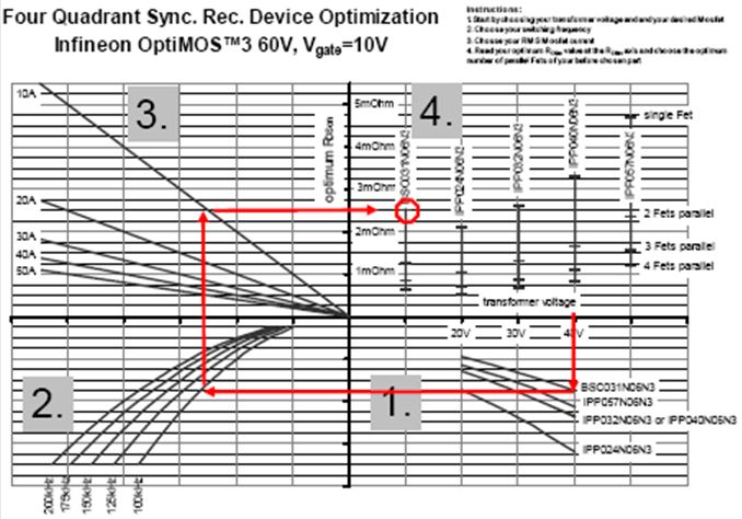 使用優化表時,首先從次級變壓器電壓開始。在所用電壓值位置,畫一條垂直的直線。在兩條線相交處可以選出特定的MOSFET。通過一條水平的直線和一條垂直的直線,便可選擇開關頻率和MOSFET電流。如前面所討論,按最好從滿負載的20%至30%的電流值開始進行選擇。此時,可以在正Y軸上讀取最優RDS(on)值。在第四個象限中,顯示了并聯MOSFET的最佳數量。在第四個象限中,必須選擇之前在第一個象限中選定的MOSFET型號。然后,按同樣的參數(變壓器電壓、開關頻率和電流RMS)對另一個型號的MOSFET重復執行這個選擇過程。比較兩次選擇所得到的最優RDS(on)值,最優RDS(on)值越低的MOSFET所產生的功耗也越低,因而是更加高效的解決方案。