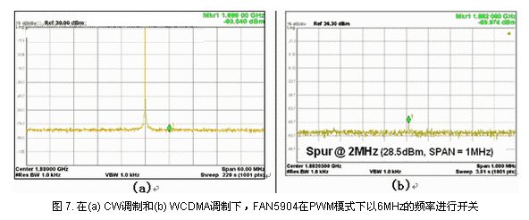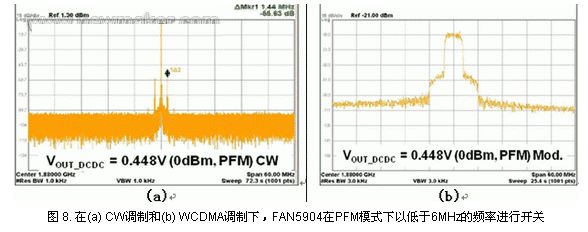 或許在PFM模式下,我們更加關注的是尖刺會在哪里進入信號調制。通過進一步查看圖8(a),在CW模式中,尖刺仍然在-40dBc以下,在8 (b)中,更重要的是該尖刺處于WCDMA調制遮蔽之下。